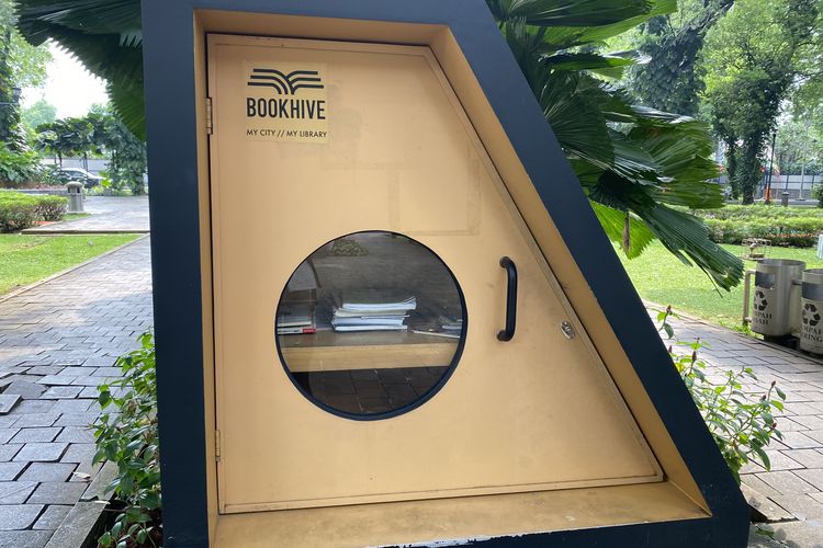 iDoPress/LIDIA PRATAMA FEBRIAN Di bawah naungan atap modern Taman Tebet Eco Park, Jakarta Selatan lemari buku BOOKHIVE dilihat dari sisi samping, Kamis (23/4/2026).